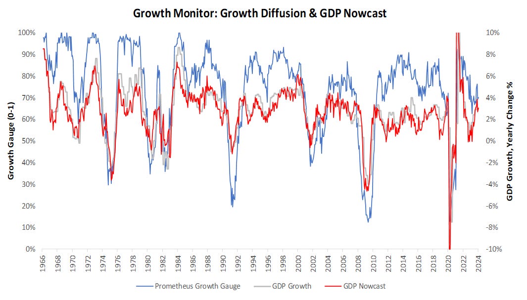 Next, we share readings from our proprietary Macro Gauges. Our Growth Gauge tracks economic data across 75 measures of real growth conditions to understand the economy and give us a more granular understanding of the forces driving our GDP Nowcast. Currently, these measures continue to point to above-trend GDP growth, with a low probability of imminent declines.