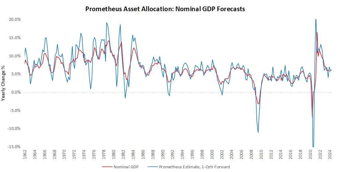Let's dive into the data driving these takeaways. Our systematic process allows us to forecast fundamental macroeconomic conditions up to one quarter ahead with modest accuracy. These views on nominal growth conditions shape our asset allocation process and a refreshed monthly. Currently, our systems estimate that Q3 2024 nominal GDP growth will be 6.1% versus one year prior, with real GDP of 3.4% and Inflation of 2.7%.