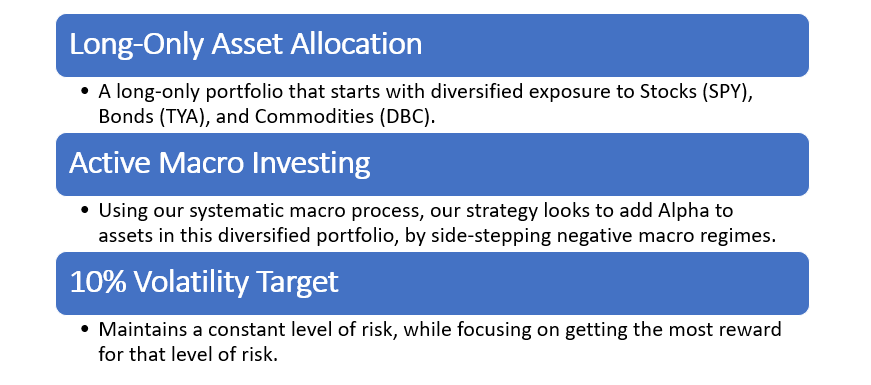 Our systematic macro process then guides the timing of entry and exit for asset exposures, optimizing our holdings to capitalize on favorable economic times and avoid downturns. We strategically invest in equities during expansions, bonds during economic slowdowns, and commodities during stagflations, employing a proprietary approach to determine these regimes.