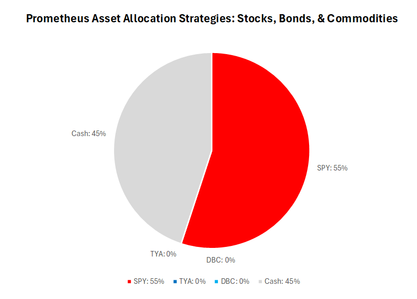 The Prometheus Asset Allocation Strategy is currently positioned long SPY (55%), flat TYA (0%), flat DBC (0%), and Cash (45%).
