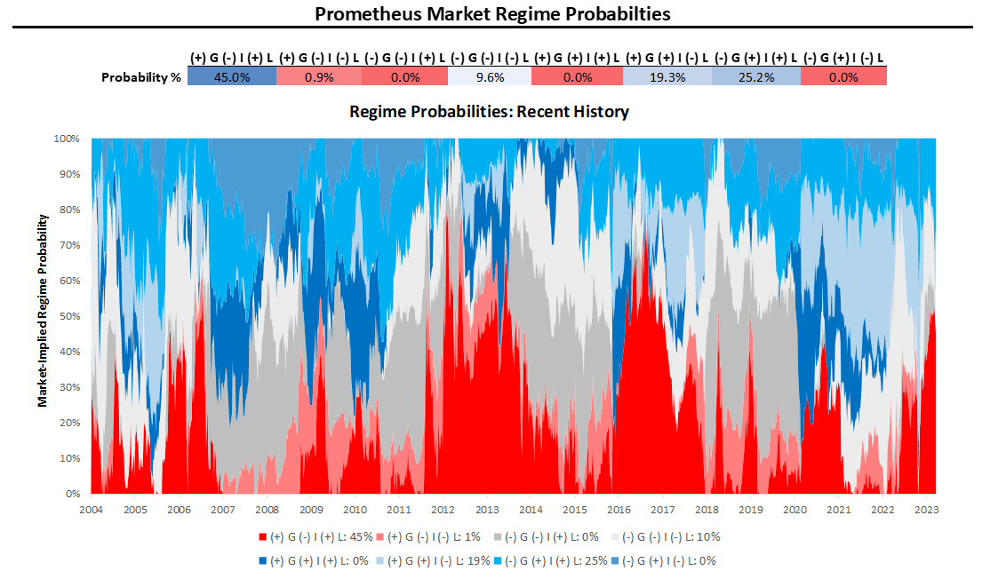 Finally, to gain an understanding of how economic dynamics have been priced into markets, we show our tracking of market-implied macroeconomic regime probabilities. Permutations of growth, inflation, and liquidity— allow for markets to price eight different regimes with varying probabilities: