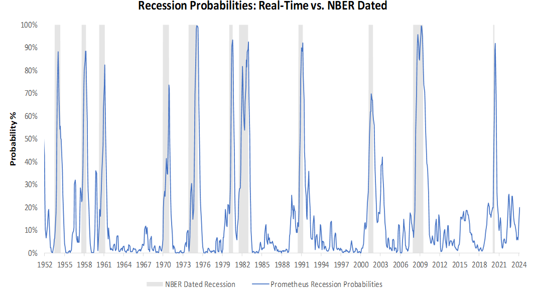 For a timely insight into recessionary pressures, we aggregate macroeconomic indicators, consistent with the NBER methodology of recession classification, into a recession probability monitor. This gauge gives us a real-time understanding of developing recessionary pressures. Currently, recession probabilities remain muted at 20%.