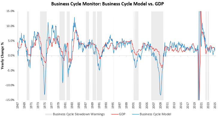 Combining the data on business investment, capital-intensive output, labor conditions, and their underlying trends, we can create a forward-looking estimate for GDP growth. The purpose of this estimate is not to be extremely precise on future GDP growth but rather to give us early indications of when we may enter into a business cycle downturn while still offering some forward-looking insight into its prospective GDP impact.
