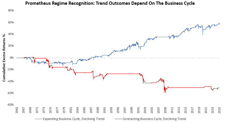 As visualized above, when the business cycle is expanding, declines in short-term trends are buying opportunities. When the business cycle is contracting, declining short-term trends are short-worthy. Buying declining trends during an expanding business cycle results in a Sharpe Ratio of 0.28. Buying declining trends during a business cycle contraction results in a Sharpe Ratio of -0.17.