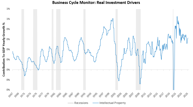 Finally, we turn to intellectual property investment. While information equipment investment showed its largest gains during the lead-up to the technology bubble only to mean-revert, intellectual property investment continues to climb in its contributions to total business investment in the modern era.