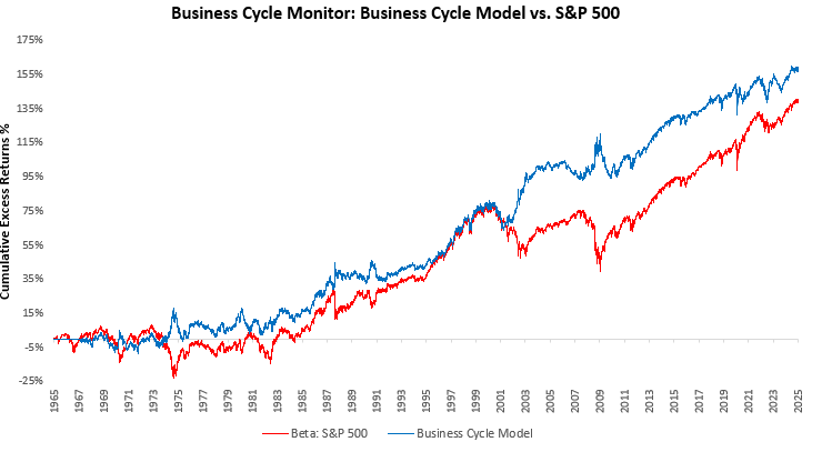 The business cycle is the cyclical variation of economic growth over time, driven by changes in business investment. These changes in business investment are a function of current and expected income, which determine output and employment. Extremes in business cycle conditions create serial correlations in the economy and markets. Extremely strong business cycle conditions result in inflation, while extreme weakness in business cycles results in recession. These extreme environments are highly influential on market trends. As such, we think a consistent, comprehensive, and timely assessment of these dynamics is key to navigating market cycles. We begin by showing how applying these assessments systematically through our Business Cycle Model can meaningfully improve or add value to equity market exposure.