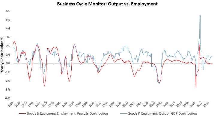 Next, we turn to goods and equipment output. These sectors drive employment in the manufacturing and trade sectors. Once again, we present these measures as contributions to total real GDP growth and nonfarm payroll growth: