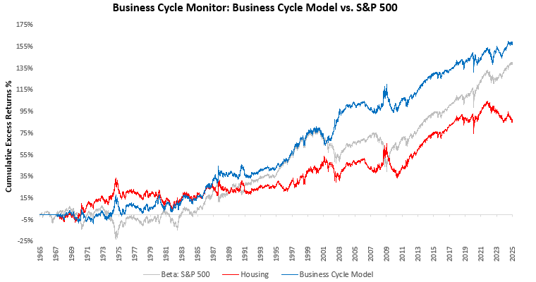 Consistent with intuition, our comprehensive business cycle approach outperforms the concentrated housing-only approach. We highlight this outperformance as it underscores the need to update more traditional leading indicator models to adapt to changes in the business cycle. Prior to the internet age, housing was the best way to generate macro alpha. Today, that role still exists but is smaller than it was previously. We will continue to prefer a comprehensive approach over a concentrated one. Currently, our Business Cycle Model continues to point to no risk of a downturn.