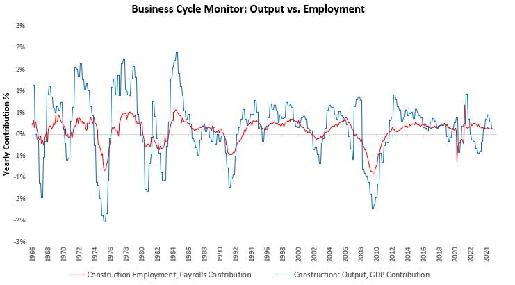 We begin with construction, comparing the trends in output growth to those of labor growth. These measures are shown as contributions to total real GDP growth and nonfarm payroll growth, respectively. This format allows us to illustrate how the GDP impact and labor impact of sectors are highly synchronized.