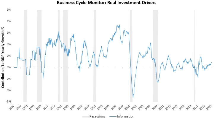 So far, we have covered the industries that have classically defined the business cycle, particularly in the pre-internet age. However, in the post-internet age, there has been an abundance of investment in the economy in the form of information equipment and intellectual property products. These areas have become crucial drivers of the business cycle. We begin by examining investment in information equipment, which includes computers, communication equipment, and related technology:
