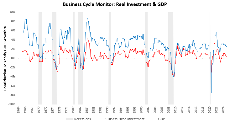 As we can see above, using our Business Cycle Model has been value-additive to equity market exposure. In this note, we evaluate the drivers of the business cycle that drive this strategy. We begin with the most important part of the business cycle: business fixed investment. Fixed investment is the dominant factor in determining whether GDP is going to experience an upswing or downturn. Further, business investment is an extremely large source of profits because it creates income that ultimately returns to businesses in aggregate. Below, we visualize how business investment defines downturns and upswings in the economy: