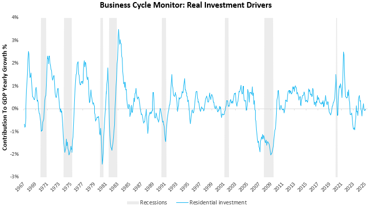 Residential investment has begun to decline recently, which is a meaningful sign of business cycle weakness.