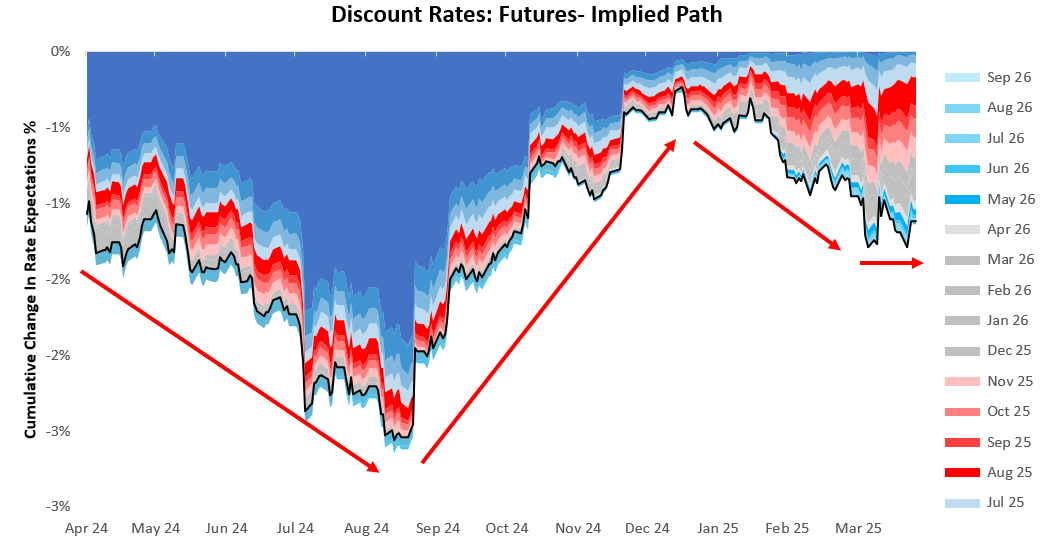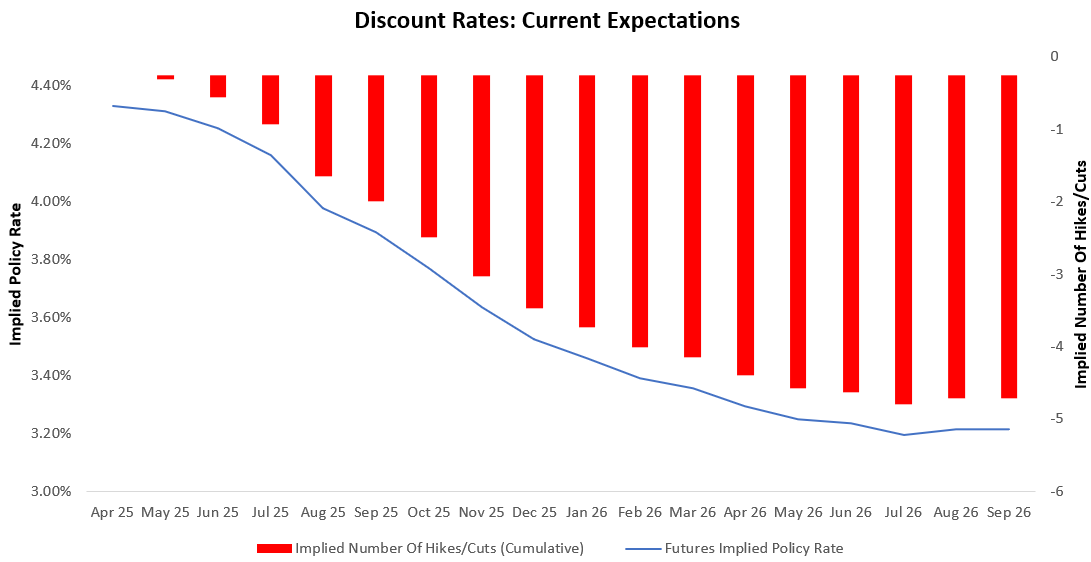 To better contextualize these recent changes in policy expectations, we show the latest discount rate path priced over the next eighteen months. Short-term interest rate markets are expecting a peak in policy rates on May 25 at 4.33%, followed by a trough on Jul 26 at 3.19%. This implies approximately four interest rate cuts cumulatively over the next eighteen months. We show this path below: