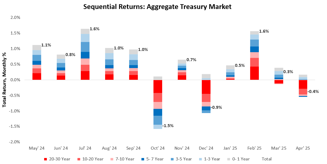 We begin with recent price dynamics. Over April, treasury markets fell by -0.37%. Over the last year, our aggregate treasury markets have returned 5.9%. Below, we show the sequential evolution of returns: