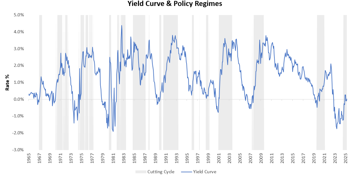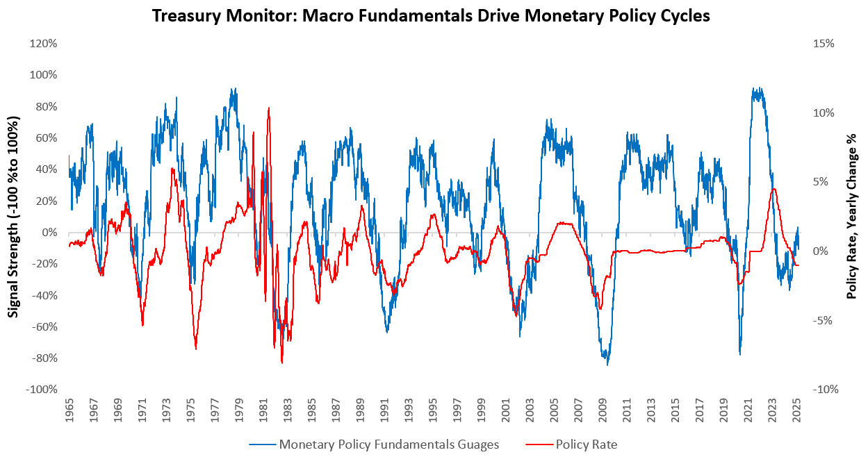 As shown above, our monetary policy gauge indicates a low potential for a meaningful easing cycle based on fundamental macroeconomic data.