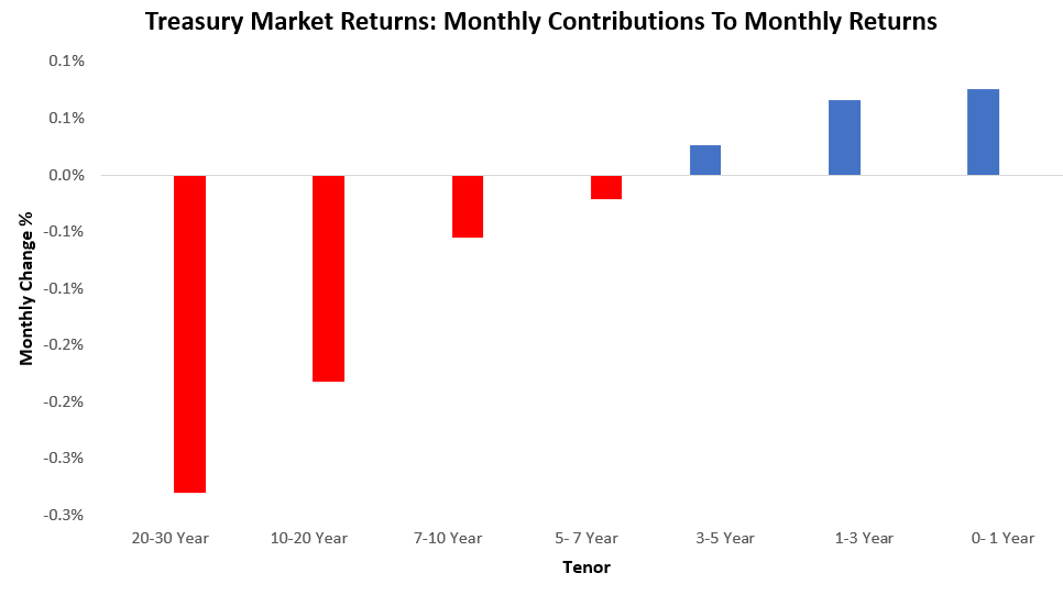 For a more granular understanding of the returns from the most recent months, we perform an attribution of total returns from various maturities of nominal treasuries across the yield curve. Over April, treasury markets were somewhat mixed, with 0- 1 Year treasuries contributing the most to strength, while 20-30 Year treasuries contributed the most to weakness. We show this below: