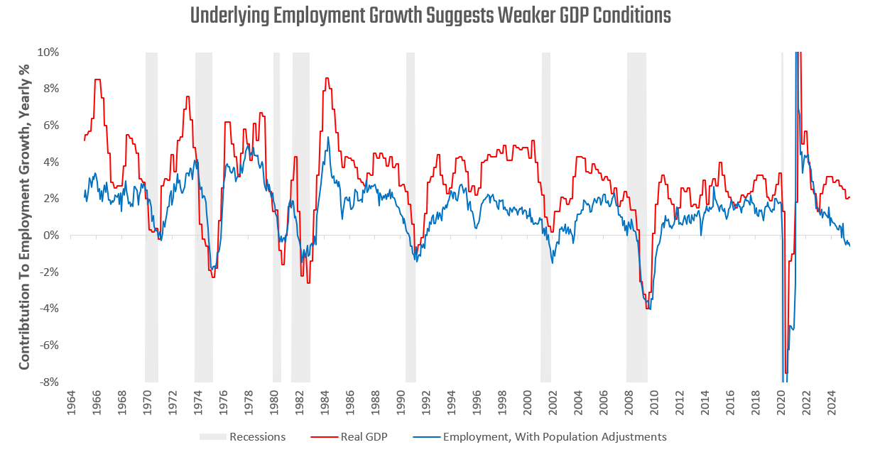 The US labor market is showing signs that are typically consistent with recessions— declining employment, rising unemployment, and cyclical weakness. Yet, nominal and real GDP conditions continue to remain positive, corporate earnings continue to expand, and risk assets stay within range of all-time highs. This constellation of macroeconomic conditions is largely inconsistent with the historical template of cause-and-effect linkages that have driven recessions through history. However, it is crucial to recognize that all recessions are driven and defined by a contraction of the labor market. As such, we think it is essential for investors to work through the mechanics of a recessionary process to contextualize today’s dynamics.