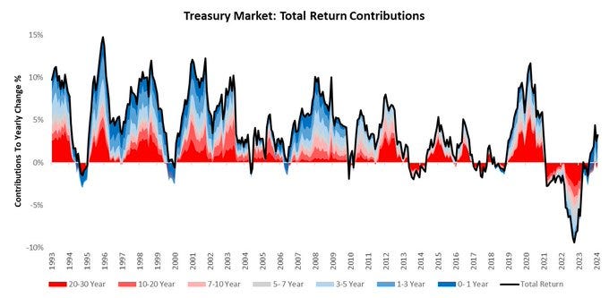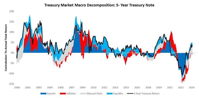 We show how this rally has largely come from discount rate expectations, i.e., markets very aggressively priced in a series of interest rate cuts in Q4 last year, which has been the dominant driver of treasury returns:
