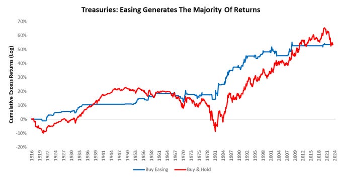 Now, while our fundamental tracking of conditions and what's priced into markets largely suggest mispricing in markets, we think it is crucial to recognize that once a cutting cycle is underway, it is not a trend to fight. Easing generates the majority of Treasury excess returns: