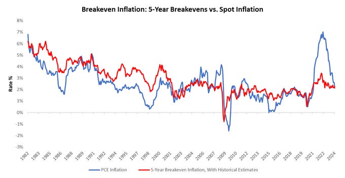 This dynamic is also consistent with the relatively muted nature of breakeven movements. Below, we show how break-evens have remained somewhat stable as spot inflation pressures have subsided: