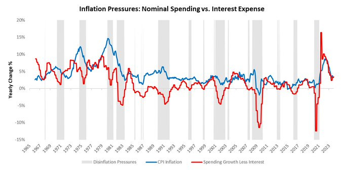 The combination of the dynamics creates a stable inflation environment. The most persistent of inflationary pressures remains the gap between nominal spending and interest expense. The tighter the gap between these two, the less credit capacity and inflationary potential:
