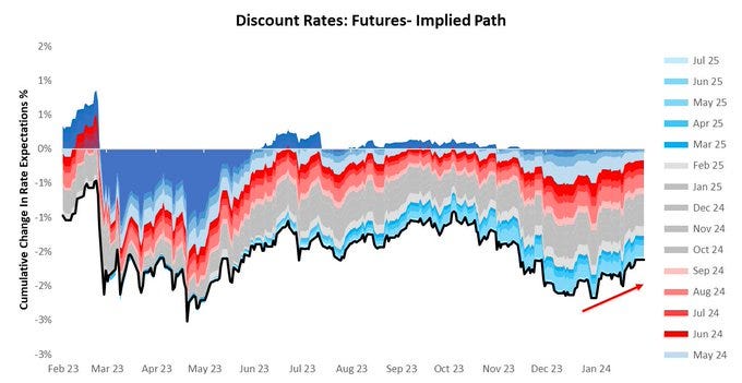 Therefore, short-rate expectations are firmly in the driving seat relative to other macro variables. This short-rate pricing has driven the rally last year and the weak performance this year. Below, we show how short-rate expectations for cuts have moderated: