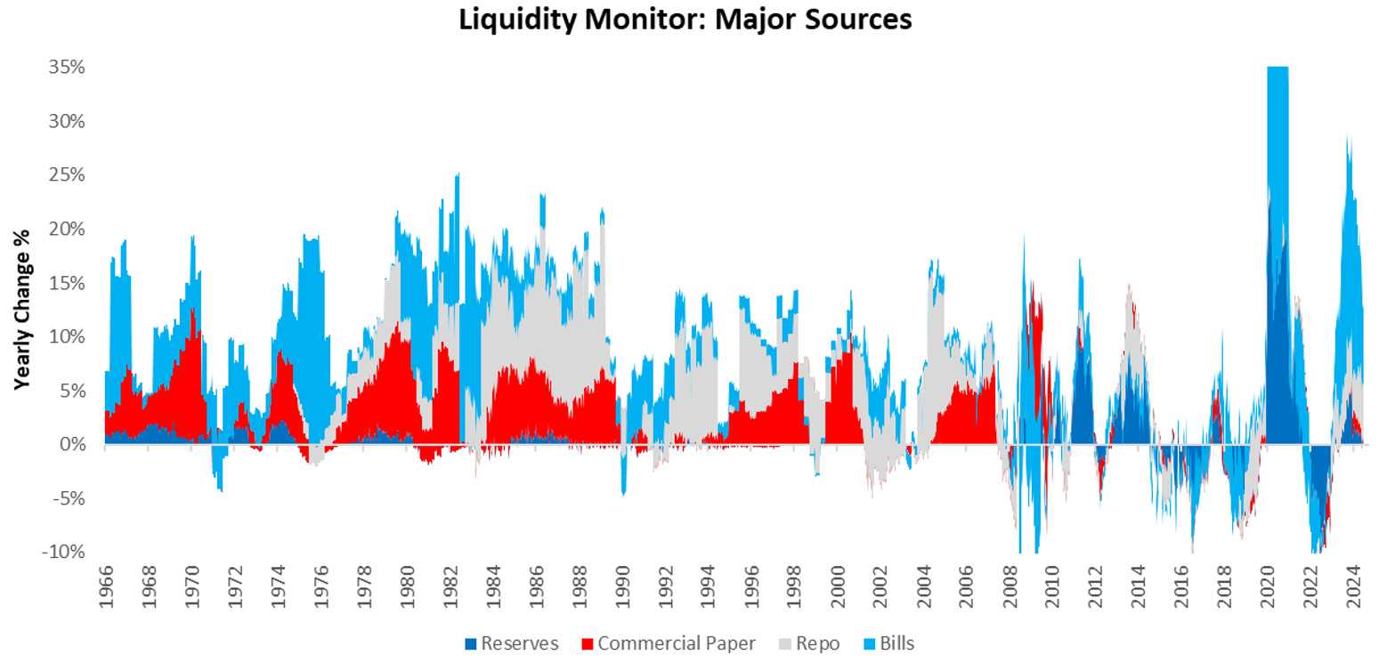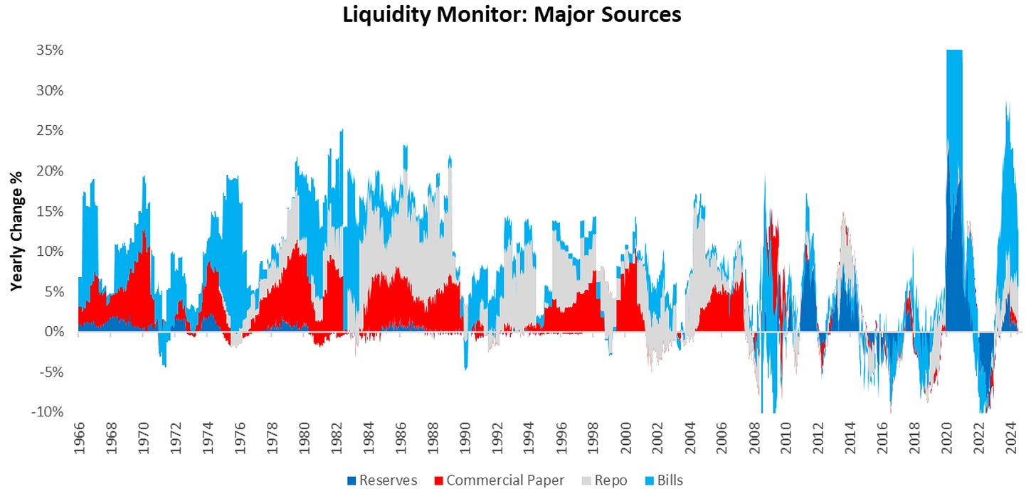 Liquidity is the flow of cash and cash-like assets that potentiate spending in the economy. Liquidity is determined by nominal dollar values and the relative risk profile of the various sources of liquidity. We begin our tracking of liquidity conditions by sharing the weighted growth rate of the major sources of liquidity: reserves, treasury bills, commercial paper, & repurchase agreements. As we can see below, the current liquidity dynamics are primarily driven by repo conditions after being dominated by treasury bill issuance.