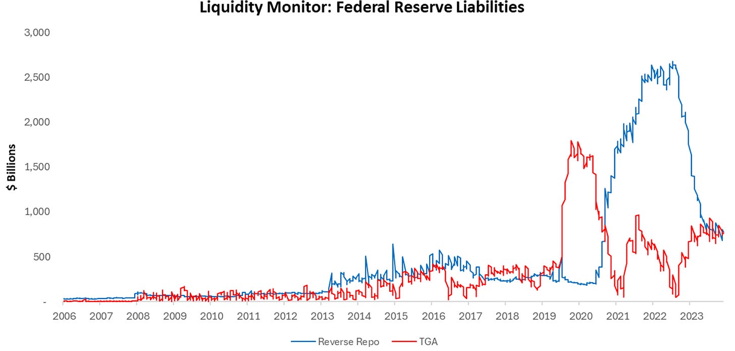 Next, examine the changes in major liabilities of the Fed, i.e. the liquidity drains on the financial sector. Note that, while the asset side is declining, the Fed liabilities, particularly the reverse repo are declining faster. Additionally, the trend in the TGA remains neutral. We visualize this below: