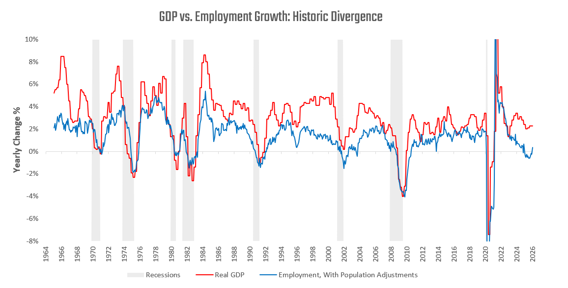 The cumulative effects of changes in population, participation rates, and unemployment rates determine employment growth. Employment growth is the most important driver of economic growth over time, mechanically driving and statistically explaining most changes in output. Employment growth directly leads to income growth, which in turn leads to spending growth. Household income and consumption are the biggest drivers of US economic activity, with employment growth as the primary engine of gains in both. Population and productivity trends slowly feed into trend rates of GDP growth, while shifts in the unemployment rate define cyclical variation. Therefore, employment growth is almost linearly related to GDP growth. The only way output and employment can meaningfully deviate from one another is if output per worker dramatically increases. This rare divergence between output and employment is what we are seeing in today’s economy. We will address this topic further in a later section. Still, for now, we stay with the mechanics—with our primary takeaway that the relationship between employment and output is fairly linear.