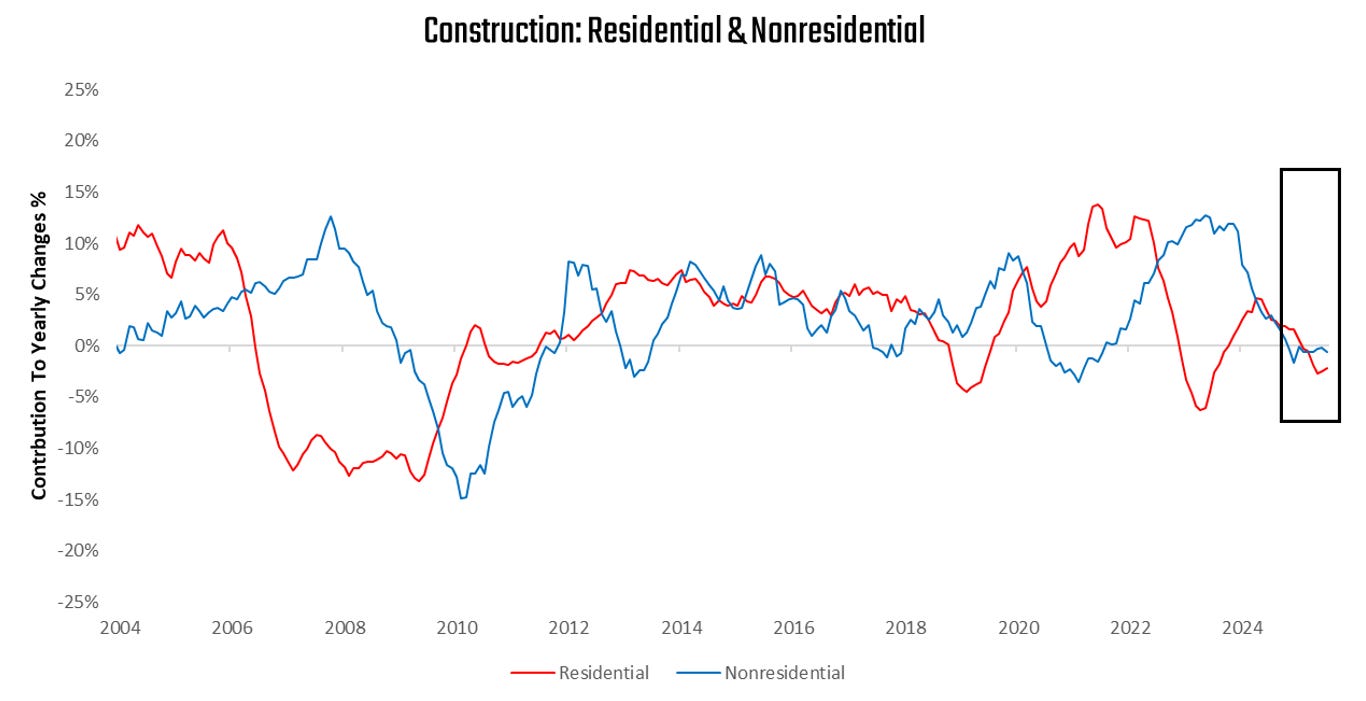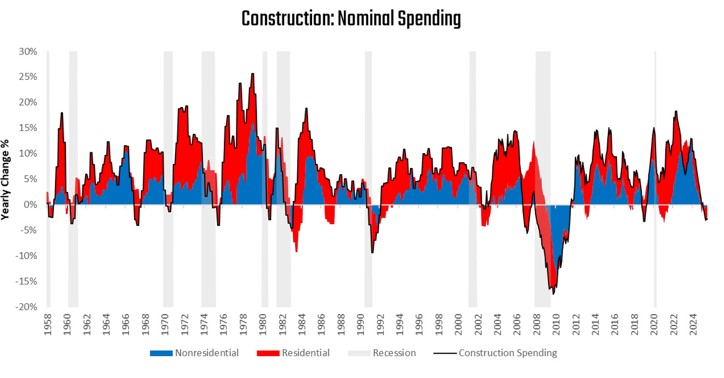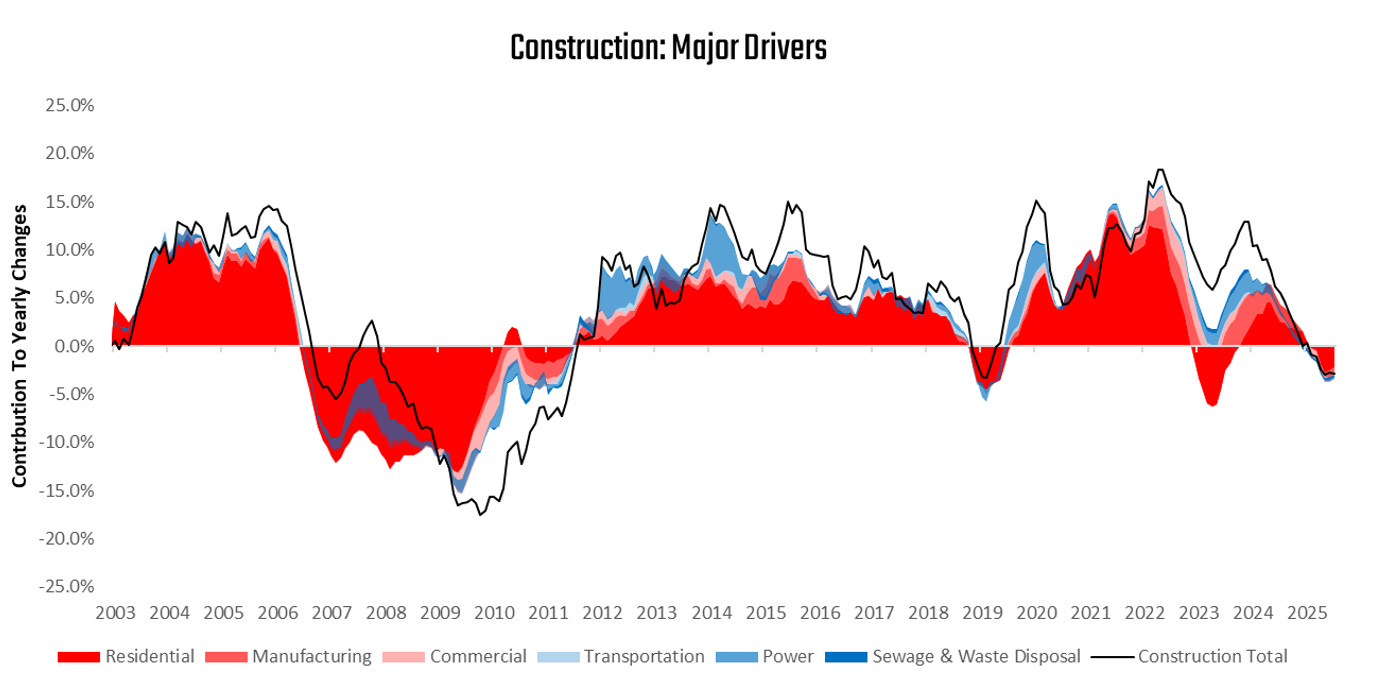 The construction sector is now experiencing weakness that is typically consistent with a recession. We show the evolution of construction spending over the last year, which fell by -2.8%%. This was driven by a -2.19% decrease in residential spending and a -0.61% fall in nonresidential spending. Below, we drill down further to show the top 3 drivers of strength in blue (Sewage & Waste Disposal, Power, and Transportation) and the top 3 drivers of weakness in red (Residential, Manufacturing, and Commercial):