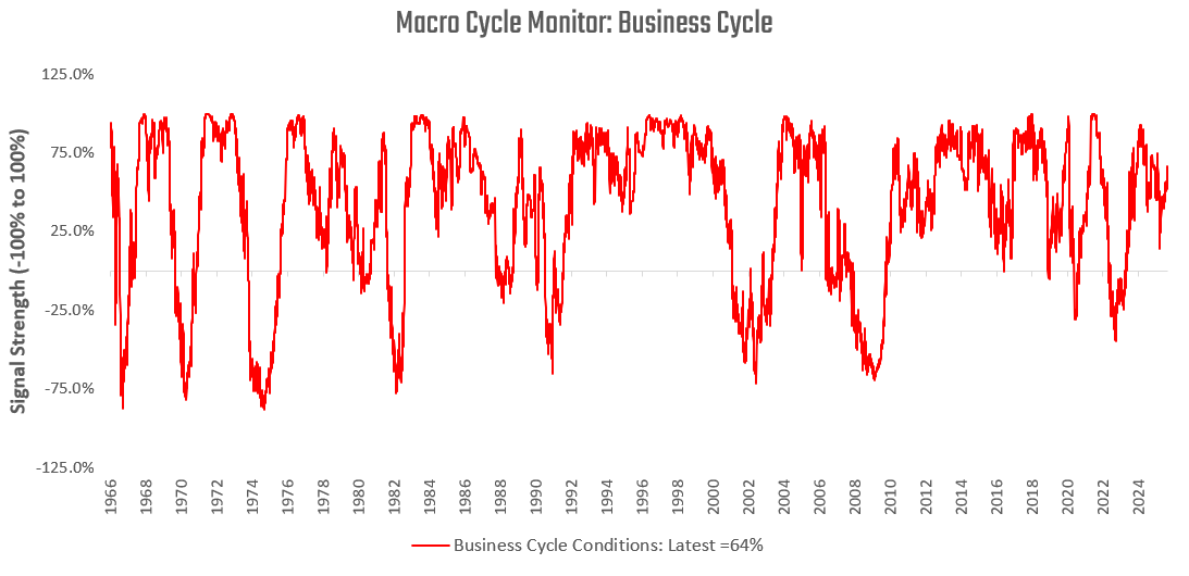 In prior cycles, this weakness in itself would have been enough to catalyze a recession. However, the evolution of the economy has made economic growth more resilient to these types of weakness. Despite weaker construction, our proprietary business cycle gauge continues to remains in positive territory:
