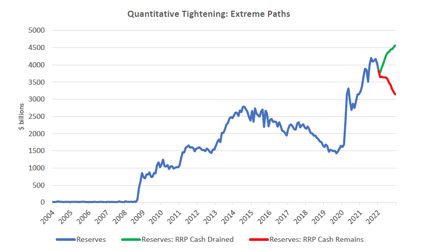 The above shows two extremes scenarios, and we estimate that reality is likely to be somewhere in between but skewed towards the scenarios where reserves decrease. There remains a significant amount that we don’t know about QT (timing & pace), along with the Treasuries’ corresponding actions. However, there is a high probability that aggregate sovereign balance sheet growth will deteriorate, coincident with worsening Growth and Inflation. This dynamic poses a headwind for risk assets, increasing market pricing odds indicative of tightening liquidity, i.e., cheaper equity market valuations, flatter yield curve, and higher credit spreads.