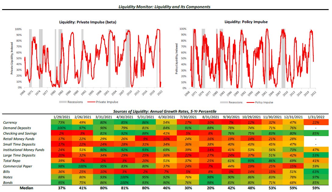 The Federal Reserve has already moved towards tighter financial conditions, signaling to markets that they are likely to raise interest rates. Further, they are now on their path to Quantitative Tightening (QT), whereby they will reduce the Fed’s balance sheet size. The aggregate size of the Sovereigns balance sheet (monetary + fiscal) is a crucial determinant in providing liquidity to the economy and markets. As we have shown, the Liquidity Impulse from policy peaked last year, and with QT, it is likely to worsen significantly. We offer our Liquidity Monitor below: