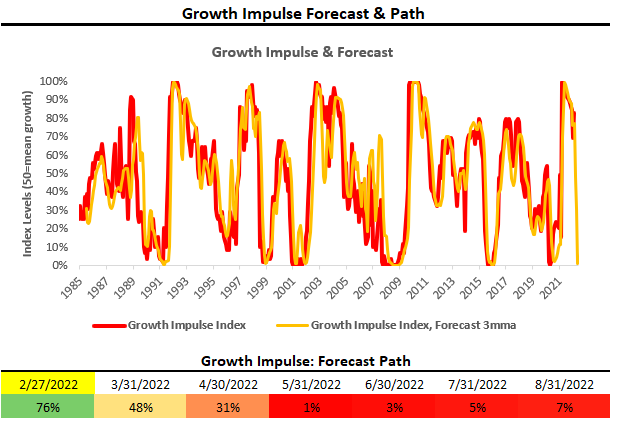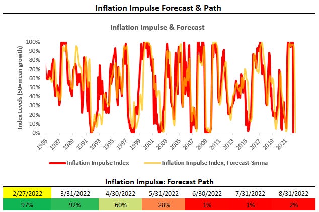 Above, we show a range of scenarios for future CPI (we choose CPI, but the outlook is the same whether we use PCEor CPI). These scenarios are based on various degrees of underlying trend strength in inflation. Our systems estimate that the post-pandemic trend is currently at 2.55%. While this might sound low relative to recent prints, keep in mind this 70-basis points above the Pre-Pandemic, Post 2008 trend of 1.79% and 55-basis points above the Fed’s target of 2%. Nonetheless, to be consistent, we include the most recent trend of 6.9% to stress-test the path of systematic output. Once again, the path is relatively consistent, regardless of the underlying trend in inflation. We must note that even if the current Inflation trend sustains itself, it approaches 0 by year-end. Consistent with this, our Inflation Impulse Index shows the impulse deteriorating through 2022: