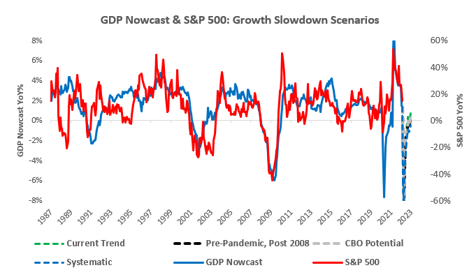 We track Growth & Inflation data daily via our GDP & Inflation Nowcasts, respectively. Further, we systematically use measures of trend and cyclicality to peek around the corner to tell us what the economic cycle holds in store. These systematic Growth & Inflation forecasts suggest significant decelerations ahead. We start by showing our estimates for future GDP Growth:
