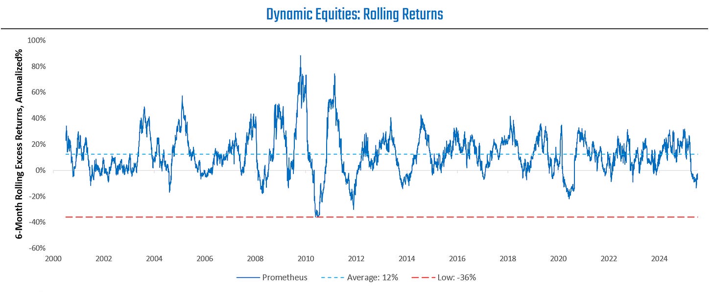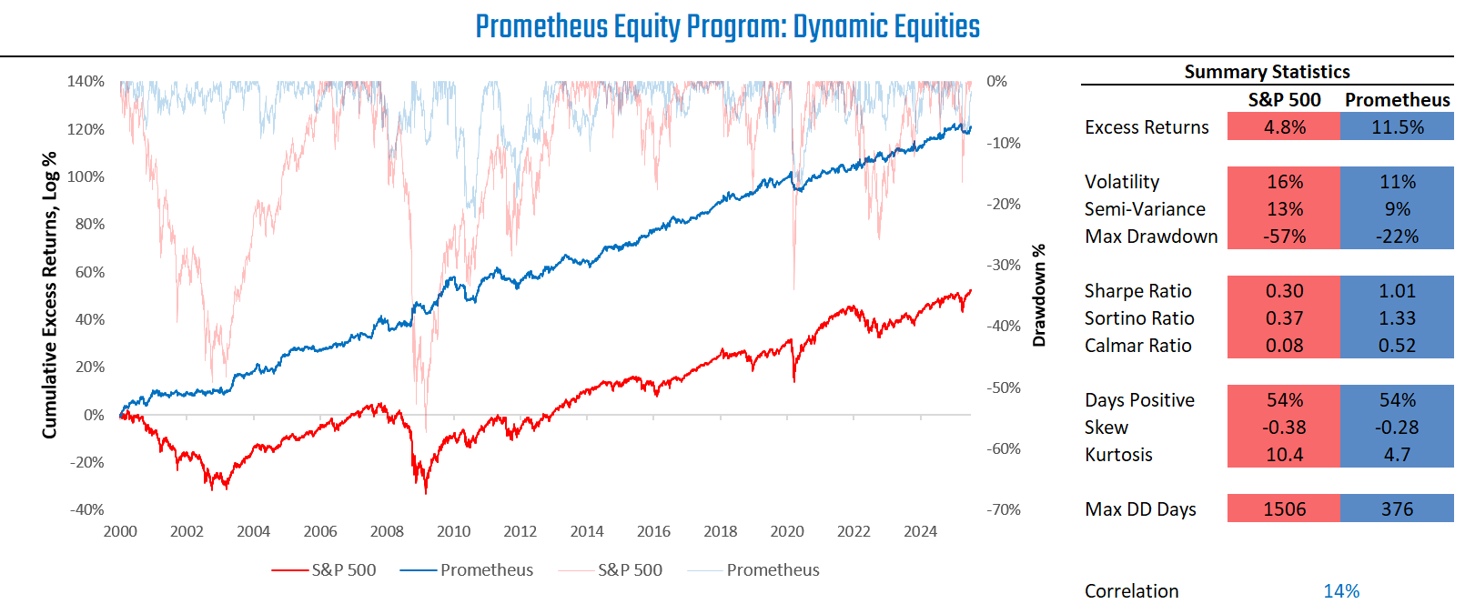 Our Dynamic Equity program allocates these two strategies equally, treating them as an independent portfolio. These two sub-portfolios are available independently as part of the Prometheus Institutional Multistrategy Program. Please feel free to reach out to us if you’re an institutional investor and this program aligns with your investment mandate.