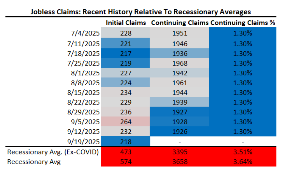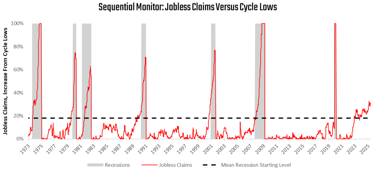 Labor markets showed more nuance. Initial and continuing claims disappointed slightly but remain well below recessionary thresholds. Our sequential monitor shows jobless claims up about 31% from cycle lows, compared to the ~18% increase that typically marks the onset of recession.