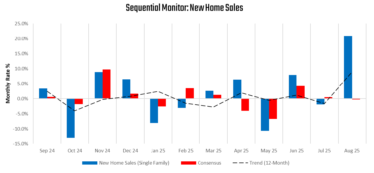 New home sales surprised to the upside, growing 20.9% versus expectations of a small decline. The strength was concentrated in completed units, while inventories remain elevated at 7.4 months’ supply, suggesting reversion pressures as sales run ahead of permits and starts: