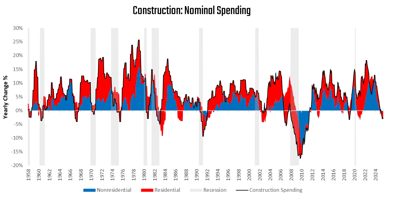 Construction data confirmed deterioration across both residential and nonresidential categories. Spending has contracted by nearly 3% year-over-year, with particular weakness in residential, manufacturing, and commercial activity. In prior cycles, this level of weakness might have tipped the economy into recession, though today’s resilience is higher: