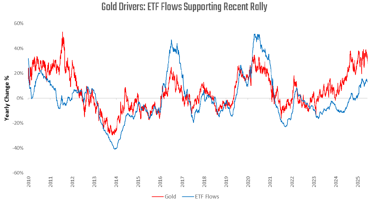 Amidst these more mixed growth conditions, gold continues to rise, driven by ETF flows: