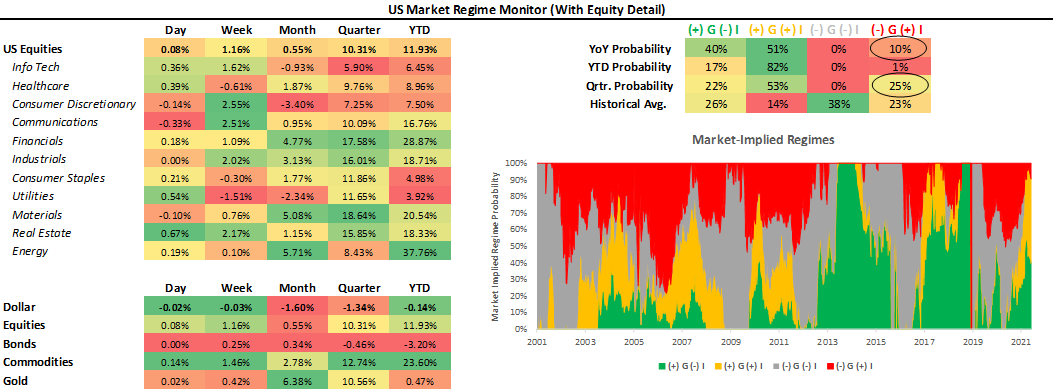 Using the performance of various asset classes, we can extract what markets are implying which particular economic regime we are in. Below, we show what markets are telling us about the current growth and inflation regime: