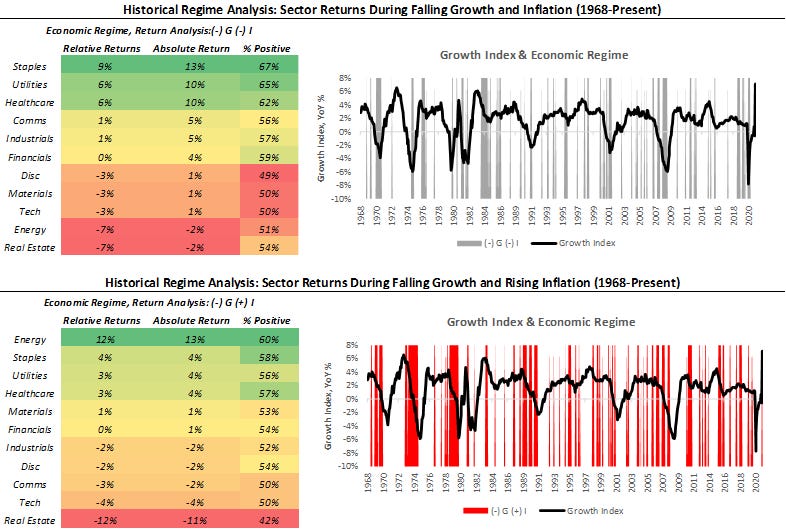 As we can see above, history has typically favored a different equity allocation mix during falling growth periods than is currently favored. Hence, as growth and inflation begin to stabilize at higher levels, we could see a significant catch-up in lagging sectors. This means that sectors currently out of favor, i.e., staples, healthcare, and utilities, could catch up to the reflation trades, i.e., financials, energy, real estate, industrials, and materials. On the asset class front, gold, TIPS, and nominal bonds would start to look more attractive relative to stocks, credit, and commodities. Of course, timing regime shifts is not a precise art, but we think incrementally adjusting portfolio exposure consistent with the lessons of history would be wise.