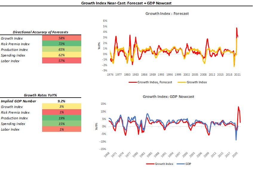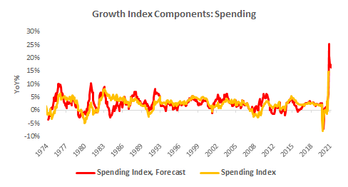 As we can see above, the Growth Index does a good job of estimating real GDP growth in real-time. The Growth Index has a directional accuracy of 88% in nowcasting real GDP growth. More importantly, unlike many regression-fitted estimates, our Growth Index actually has greater accuracy in nowcasting GDP downturns- our downside directional accuracy is 95%. When we think about our Growth Index, we prefer to focus not on the estimated magnitude of the nowcast but rather the acceleration or deceleration of the nowcast. As we can see above, the Growth Index is pointing to an extremely strong nowcast, i.e., GDP Growth will likely peak in Q2 according to our Growth Index.