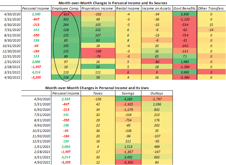 As we can see, the COVID-19 Laggard Basket is significantly outperforming the COVID-19 Leader Basket, consistent with both our systematic and discretionary analysis over the last few months. Moreover, this redistribution has come on the back of economic reopening and income stimulus, both of which have elevated incomes. We show this below: