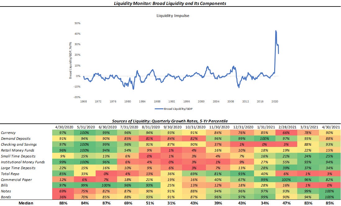Liquidity growth remains strong and broad-based, albeit not at the pace we saw last year. Particularly, Treasury securities have shown strong growth rates over the last few months, consistent with the new monetary, fiscal regime. Given the continuation of QE and coincident fiscal expansion, we expect liquidity to remain abundant over the next few months.