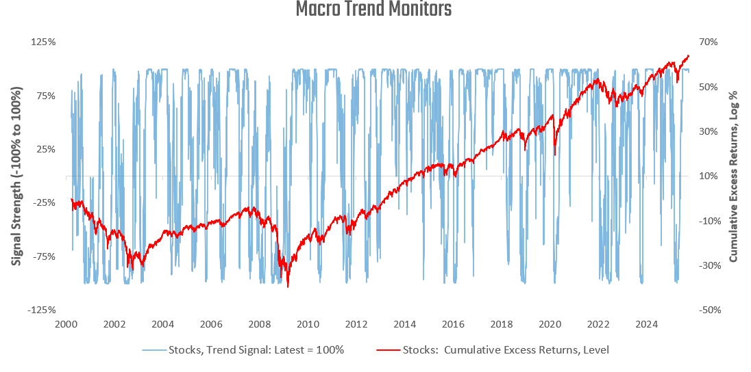 Asset prices in aggregate reflect changes in conditions relative to expectations. As such, carefully monitoring macro market trends is an integral part of evaluating conditions in the macroeconomy. To do this, we use our macro trend monitors, which we share here. We begin with stocks:
