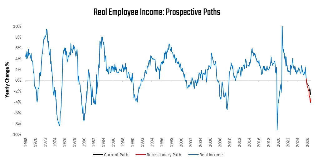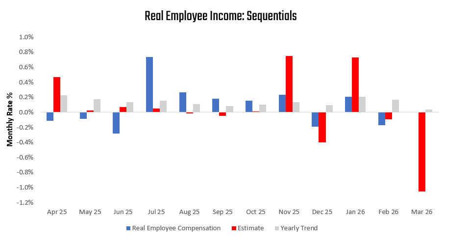 Our latest estimates for March showed real employee income decreased by -1.05%. Now, these estimates are subject to a significant margin of error. As such, they may overestimate the extent of weakness. The last time we experienced such a significant move in our estimates was in January 2022, which we find somewhat analogous to today. Regardless of the accuracy on the magnitude, our estimates are consistent with the direction of the pressures. Extrapolating the current rate of weakness, the future path of real incomes may well be recessionary: