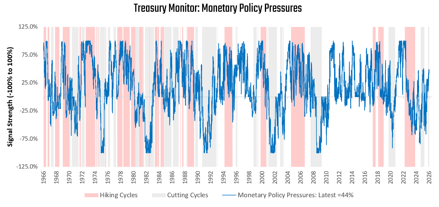 Currently, these measures suggest marginal downside pressure on Treasuries from positioning; however, the pressure on policy rates to rise from strong economic activity remains meaningful. Headwinds for Treasuries persist.