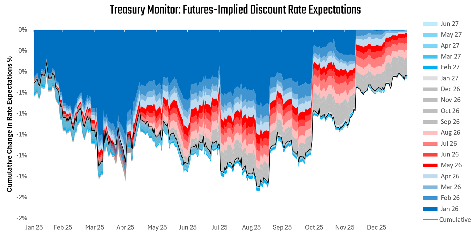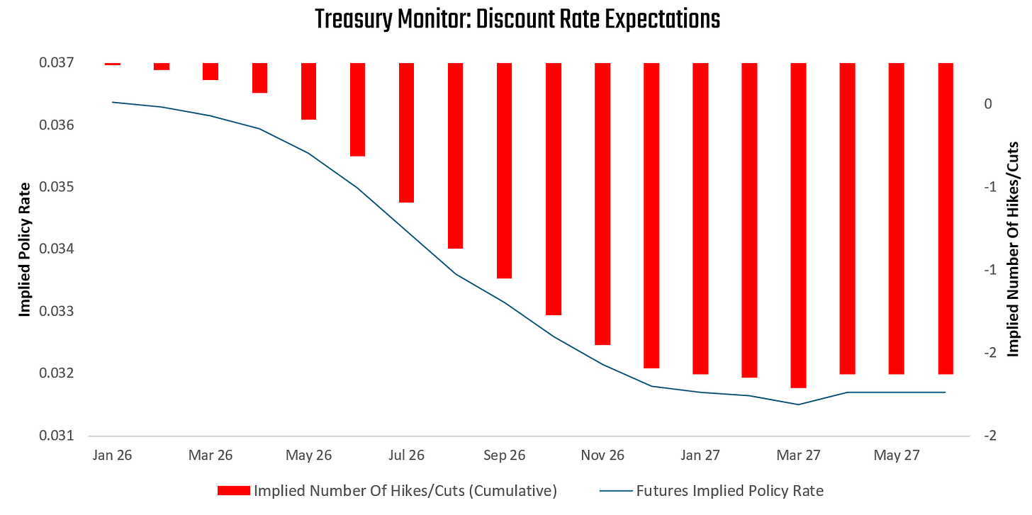 To better contextualize these recent changes in policy expectations, we show the latest discount rate path priced over the next eighteen months. Short-term interest rate markets are expecting a peak in policy rates on Feb 26 at 3.64%, followed by a trough on Jan 2027 at 3.18%. This implies approximately 2 interest rate cuts cumulatively over the next eighteen months. We show this path below: