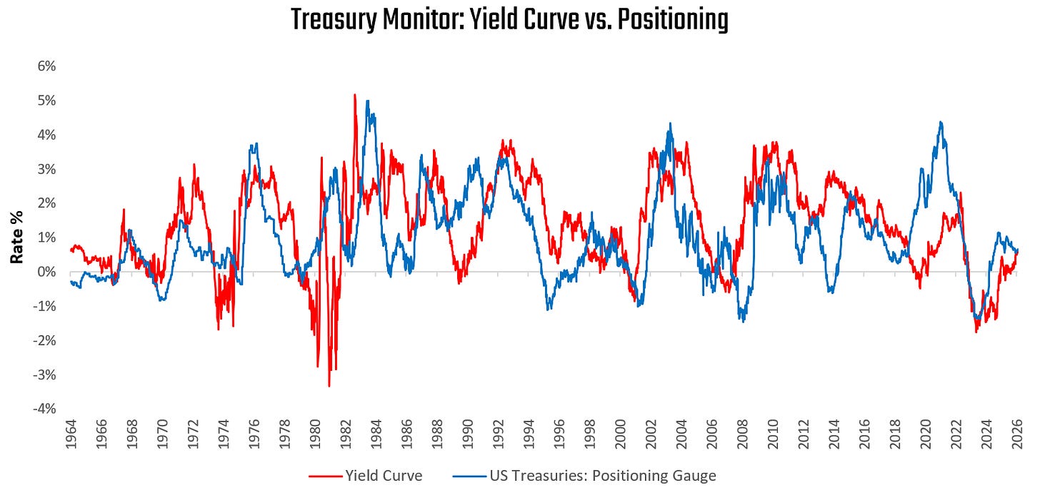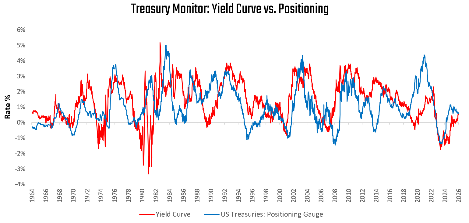 Having examined the pricing of discount rates, we turn to the shape of the yield curve. We compare the curve to positioning to assess bond attractiveness. When the curve offers more carry than positioning reflects, positioning typically catches up via increased duration exposure. When positioning exceeds what the curve justifies, trades become crowded and vulnerable to reversal. Currently, US yield curves show modest vulnerabilities for 10-year Treasuries:
